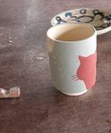 歌留多の湯飲み用にゲージツ作品作るぞって、リキ入れて取り掛かったのですが・・・・う〜〜ん、釉薬で描くのは慣れた友禅のようにはいきませんね。芸術作品は諦めて、、、出来上がったものは、やっぱり猫柄でした(笑)赤い釉薬で描いた部分は焼きあがると黒に、絵柄は藍と薄いピンクだそうで・・・送られてくる一ヵ月後が楽しみです♪