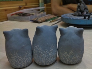 画像は、信楽白土で形を作った後衣装部分に黒化粧土を施し、ピンでかき削って模様を描いたマトリョーシカです。完全に乾いたら素焼きして呉須で顔を描き、透明釉をかけて本焼きです♫